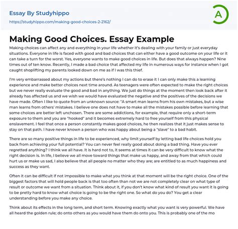 Download making good choices essay Doc online is a convenient and frugal way to read making good choices essay you love right from the comfort of your own home. Yes, there sites where you can get Doc "for free" but the ones listed below are clean from viruses and completely legal to use.